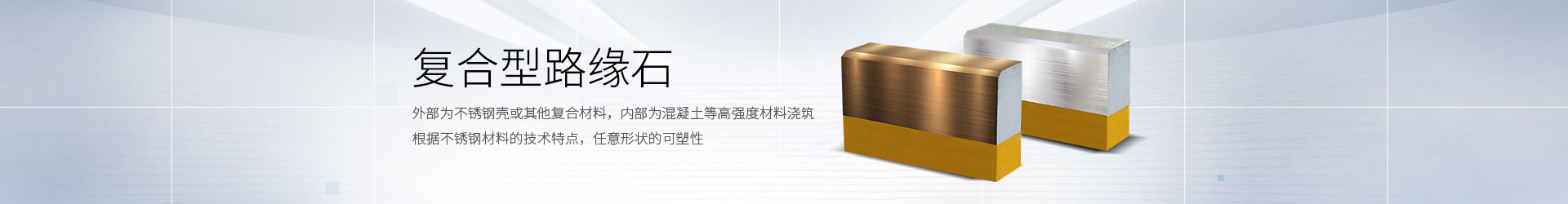 为了克服现有路缘石强度低、样式单一、污染环境等问题,本复合型路缘石采用的技术方案是:此路缘石是由两种材料构成,外部为不锈钢壳或其他复合材料,内部则是混凝土或者一些别的材料浇筑。根据不锈钢材料的技术特点,任意形状的可塑性,必将开启路缘石的技术革新,从而创造出更多新形式复合型路缘石。
